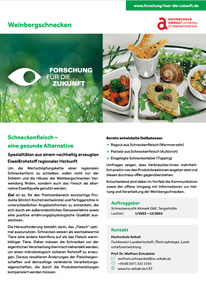 Um die Wertschöpfungskette einer regionalen Schneckenfarm zu schließen, sollen nicht nur der Schleim und die Häuser der Weinbergschnecken Verwendung finden, sondern auch das Fleisch als alternative Eiweißquelle genutzt werden.