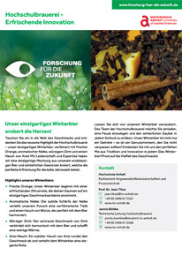 Lassen Sie sich von unserem Winterbier verzaubern. Das Team der Hochschulbrauerei möchte Sie einladen, eine Pause einzulegen und den winterlichen Zauber in jedem Schluck zu erleben. Unser Winterbier ist nicht nur ein Getränk – es ist ein Genussmoment, den Sie nicht verpassen sollten! Entdecken Sie mit uns den perfekten Mix aus Tradition und Innovation in jedem Glas Winterbier! Prost auf die Vielfalt des Geschmacks!